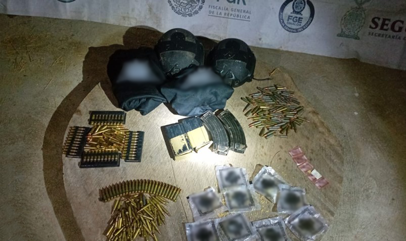 En Elota, elementos federales aseguraron 419 cartuchos útiles, cuatro cargadores, dos cascos balísticos y pequeñas cantidades de marihuana y cristal. Los objetos quedaron bajo resguardo del Ministerio Público.