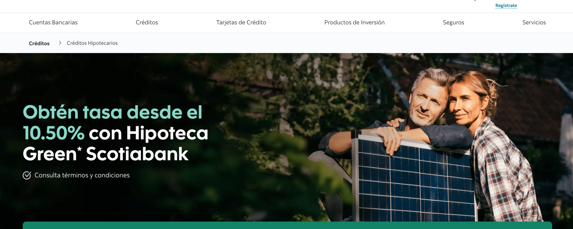 En colaboración con Solfium empresa de soluciones de energía solar, se han integrado paquetes de paneles solares como parte del financiamiento hipotecario para facilitar a los clientes de Scotiabank el acceso a viviendas más sustentables, promoviendo los beneficios de optar por espacios que representan ahorros a largo plazo y menor impacto ambiental.