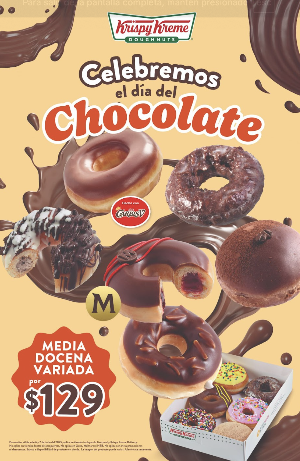 Con motivo del Día del Chocolate, la cadena internacional Krispy Kreme anunció una promoción especial para los días 6 y 7 de julio, en la que ofrecerá su media docena variada a un precio reducido de $129 pesos.