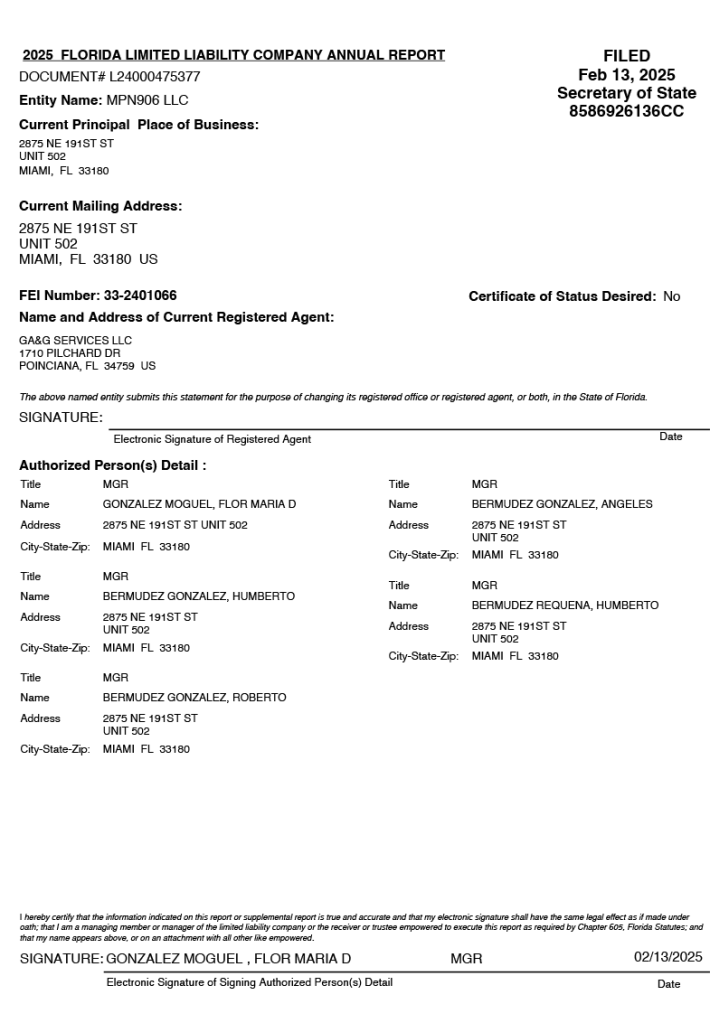 El inmueble del hermano de Hernán Bermúdez, valuado en 1.3 millones de dólares y ubicado en el condominio de lujo Marina Palms Residences, lo compró a través de la empresa MPN906 LLC, la cual fue establecida en Florida el 8 de noviembre de 2024 por su esposa, Flor María de los Ángeles Moguel.