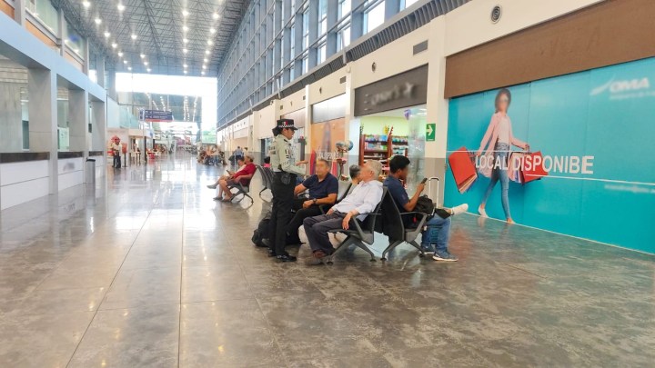 En Guerrero, integrantes de la militarizada Guardia Nacional realizan recorridos de proximidad social y seguridad en el Aeropuerto Internacional «General Juan N. Álvarez« de Acapulco.