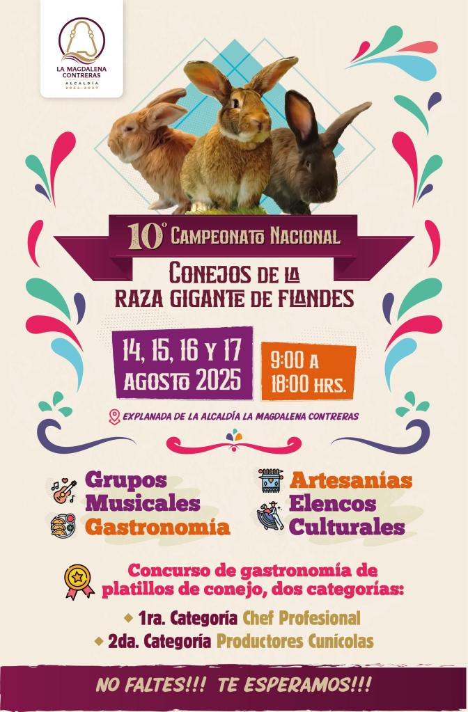 La Alcaldía La Magdalena Contreras invita a toda la comunidad, visitantes y amantes de las tradiciones al Décimo Campeonato Nacional de Conejos de la Raza Gigante de Flandes, que se llevará a cabo del 14 al 17 de agosto de 2025, de 9:00 a 18:00 horas, en la Explanada de la Alcaldía.