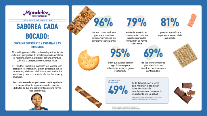 En el contexto del Día Internacional de la Juventud, el estudio subrayó que los Millennials y la Generación Z han modificado su relación con los snacks. Más del 56% de ellos los consideró una vía para mejorar el estado de ánimo, relajarse o encontrar confort. Además, el 74% priorizó el control de porciones en sus elecciones de consumo.