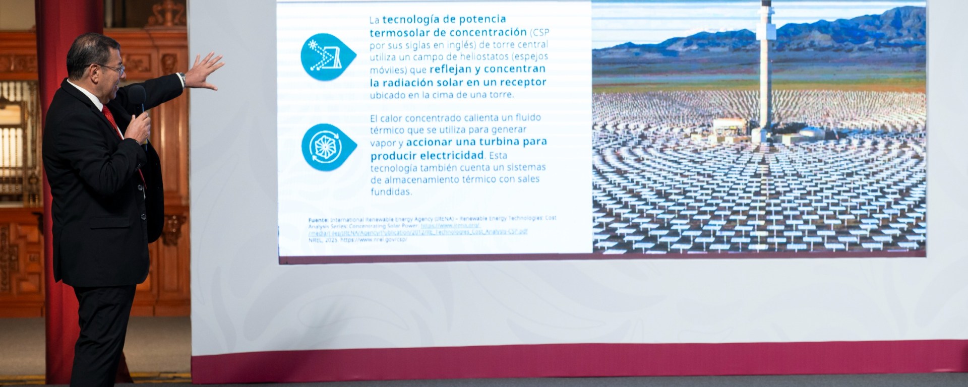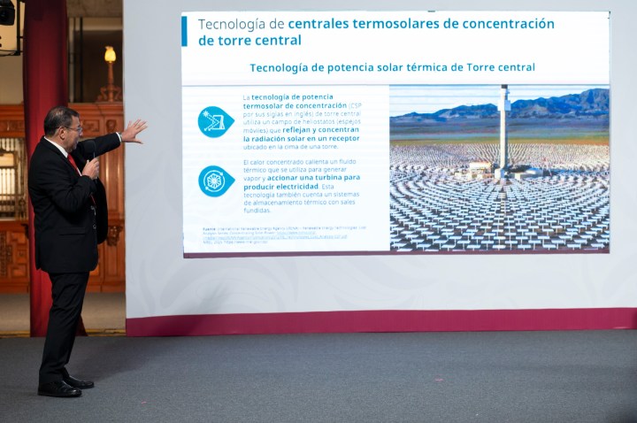 El subsecretario Jorge Marcial Islas Samperio detalló la tecnología implementada. Precisó que consistió en almacenar calor solar mediante sales fundidas para generar electricidad nocturna.
