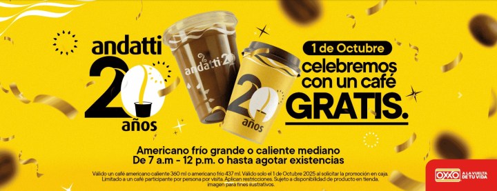 El próximo miércoles 1 de octubre, Oxxo celebra dos hitos en su historia: el vigésimo aniversario de andatti y el Día Internacional del Café. Por este motivo, la cadena de conveniencia ofrecerá café gratuito en sus más de 24 mil tiendas.