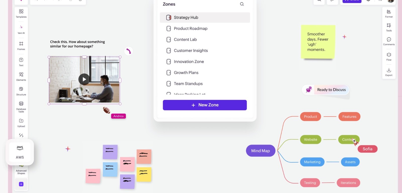 Vani incorporó videollamadas nativas dentro del lienzo compartido. Esto posibilitó reuniones rápidas, grabaciones para consultas posteriores y colaboración asincrónica, sin necesidad de aplicaciones externas para comunicación en tiempo real.
