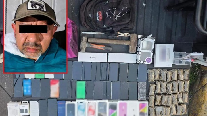 En el interior del automóvil se localizaron dos mochilas que contenían 41 teléfonos celulares de distintas marcas, dos relojes inteligentes, dos cargadores, cuatro fundas para teléfono y una agenda telefónica, además de herramientas como mazos y cinceles.