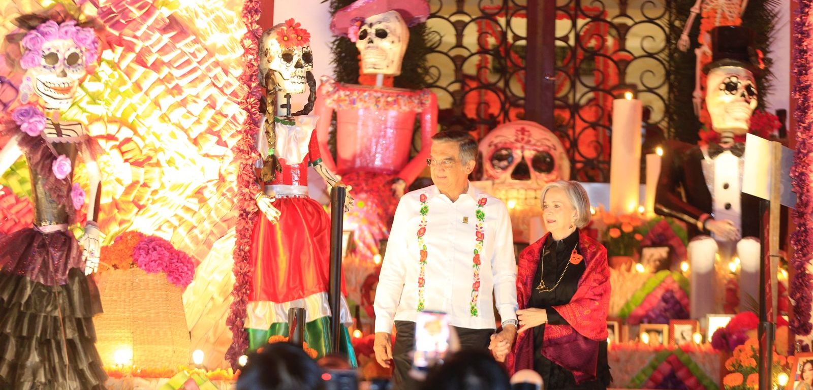 Ciudad Victoria, Tamaulipas.- En un ambiente impregnado por el aroma de la flor de cempasúchil, el pan de muerto y las luces de las velas, el gobernador Américo Villarreal Anaya y la presidenta del Sistema DIF Estatal, María de Villarreal presidieron la premiación del concurso estatal de catrinas y catrines «Almas Tamaulipecas» y la muestra del altar monumental del Día de Muertos en las escalinatas de Palacio de Gobierno .