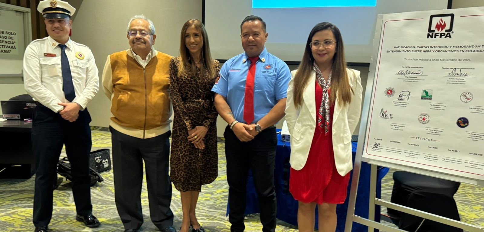 Cabe destacar que, los titulares de los organismos que firmaron el convenio fueron: Asociación Mexicana de Jefes de Bomberos AMJB: Marco Antonio Sánchez Guerrero presidente, Jorge Francisco Suárez Peredo comisionario, y Rodolfo Roa Casas; Federación de Colegios de Ingenieros Mecánicos, Electricistas, Electrónicos y Ramas Afines de la República Mexicana, A.C. FECIME: Eduardo Llamas Esparza presidente, Francisco Serna Báez. comisionado; Asociación de Unidades de Verificación de Instalaciones Eléctricas, A.C. AMUVIE: Luis Ignacio Olvera Ochoa presidente, Carlos Betancourt De León secretario, Daniel Mauricio Reynada Ramos Tesorero; Unión Nacional de Constructores Electromecánicos, A.C. UNCE: Efrén Rodríguez Rubio presidente, Pedro Javier Narváez Castañeda secretario; AMPCI Asociación Mexicana de Protección Contra Incendios, A.C.: María Magdalena García Olguín πresidente, Juan Antonio Castro Reyes presidente electo 2025-2027. ASUME Sociedad Nacional de Industriales de Seguridad Privada A.C.: Sergio Eduardo Loyola Hidalgo director general. –sn–