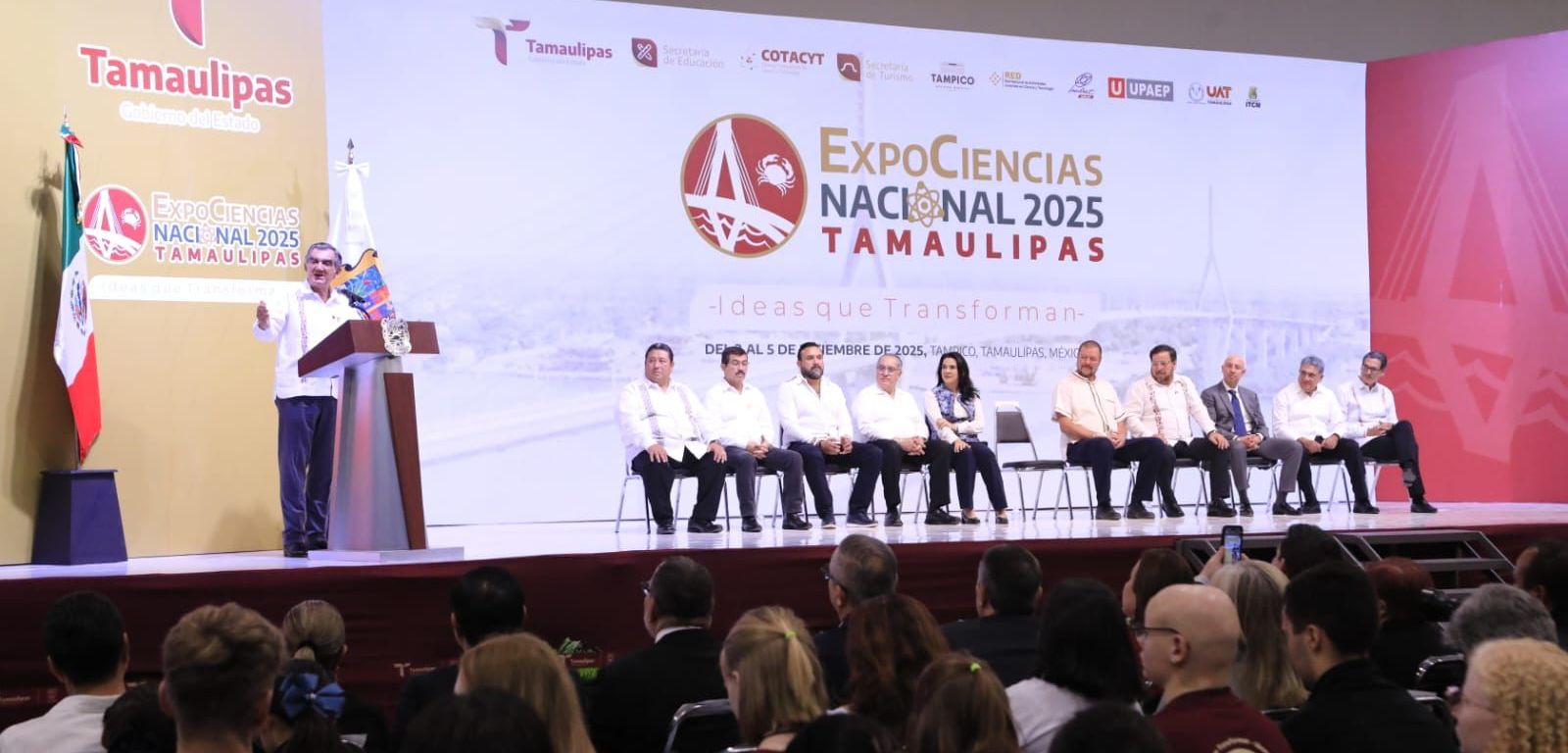 Tampico, Tamaulipas.- Al inaugurar la ExpoCiencias Nacional Tamaulipas 2025, un encuentro que reúne a 1500 participantes con los 500 mejores proyectos de ciencia, innovación y tecnología, elaborados por niños, niñas y jóvenes, el gobernador Américo Villarreal Anaya refrendó todo su apoyo para seguir con la visión de la presidenta Claudia Sheinbaum y poner el conocimiento y el avance científico a favor del bienestar social.