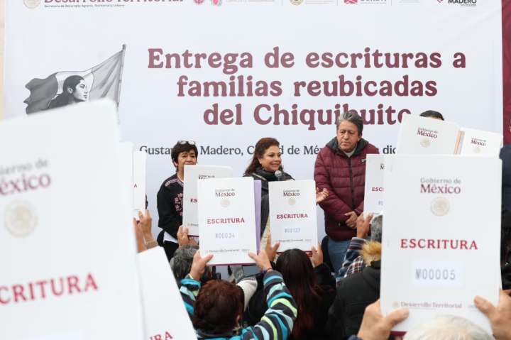 La presidente Claudia Sheinbaum Pardo encabezó la entrega de escrituras a 354 familias que fueron reubicadas del Chiquihuite en la alcaldía Gustavo A. Madero, y recordó que este proceso surgió de un compromiso asumido durante su gestión como jefe de Gobierno en la ciudad de México (Cdmx), y afirmó que la conclusión del proyecto cumplió la promesa pública original.