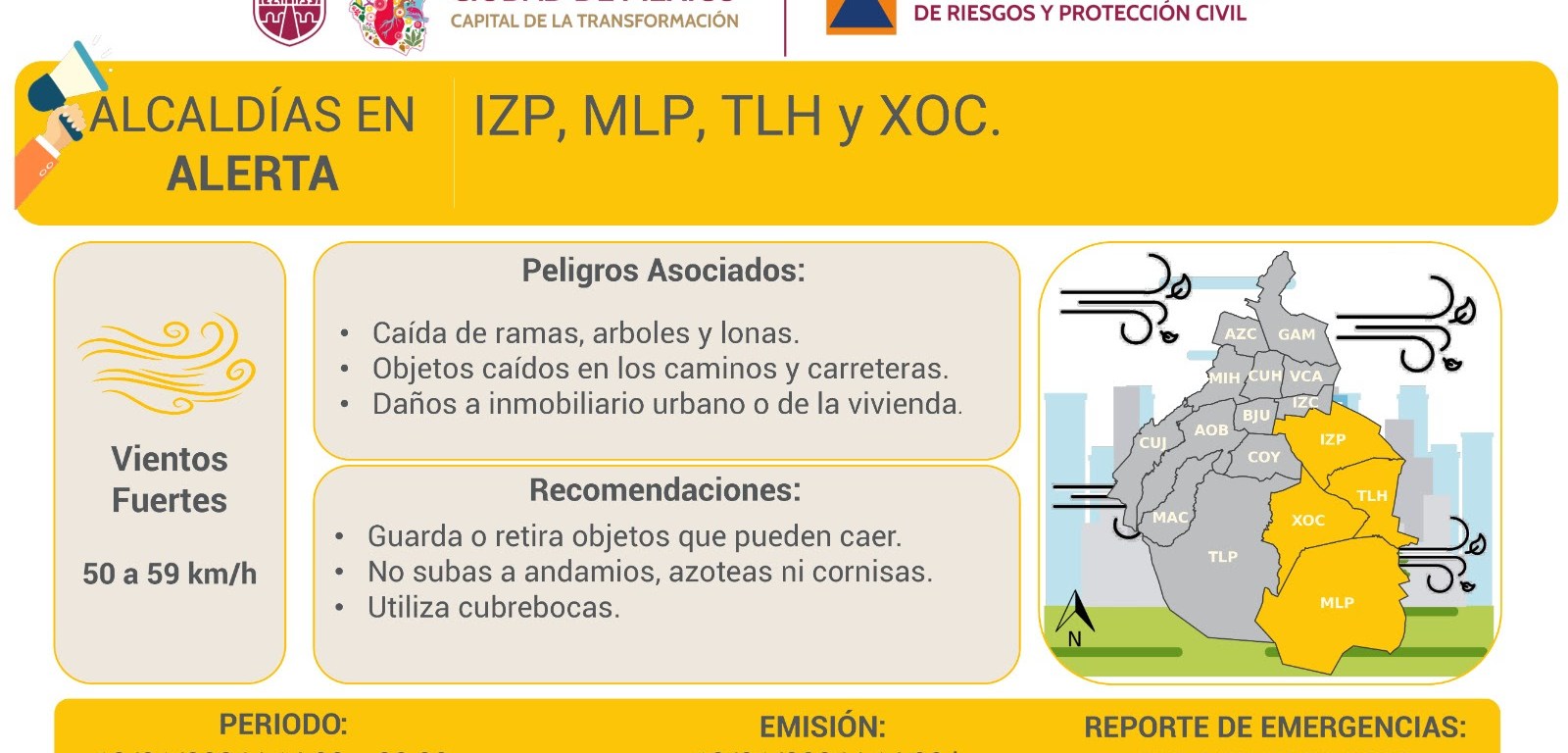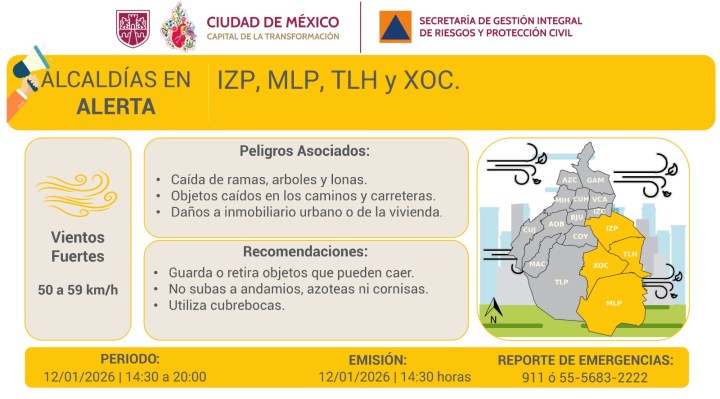 La Secretaría de Gestión Integral de Riesgos y Protección Civil (SGIRPC) informó que activó la Alerta Amarilla por intensificación de vientos. La medida aplicará durante la tarde y noche del lunes 12 de enero de 2026. Las demarcaciones consideradas fueron Iztapalapa, Milpa Alta, Tláhuac y Xochimilco.