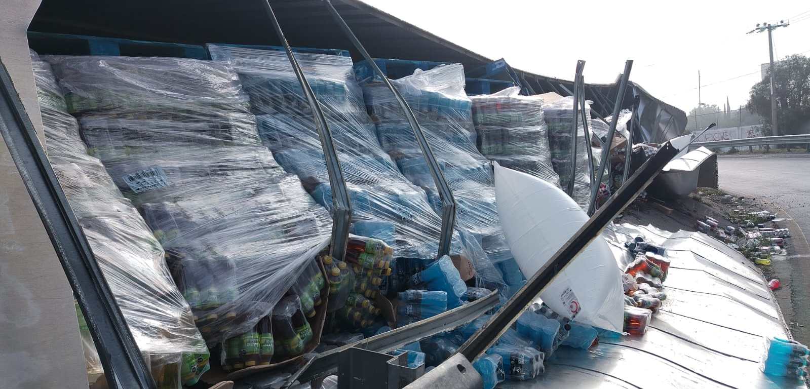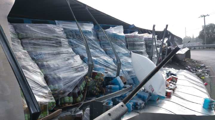 El tractocamión, conducida por Edwin “N”, de 27 años de edad, se dirigía de Tepotzotlán a Veracruz y transportaba jugos y bebidas alcohólicas, por lo que al dar vuelta se registró la volcadura.