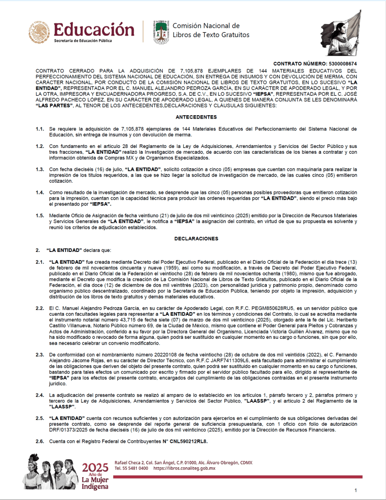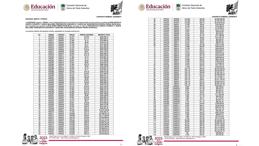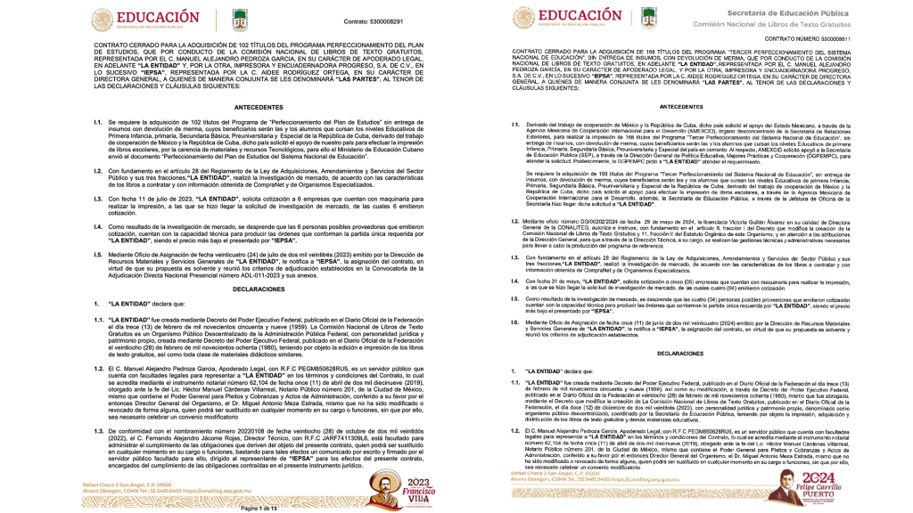 En el documento, que aparece en la página de la Conaliteg, ésta se compromete a pagar casi 189 millones 360 mil pesos a Impresora y Encuadernadora Progreso (IEPSA), empresa de participación estatal mayoritaria, por la impresión de 7.1 millones de ejemplares de 144 materiales educativos del “Perfeccionamiento del Sistema Nacional de Educación”.
