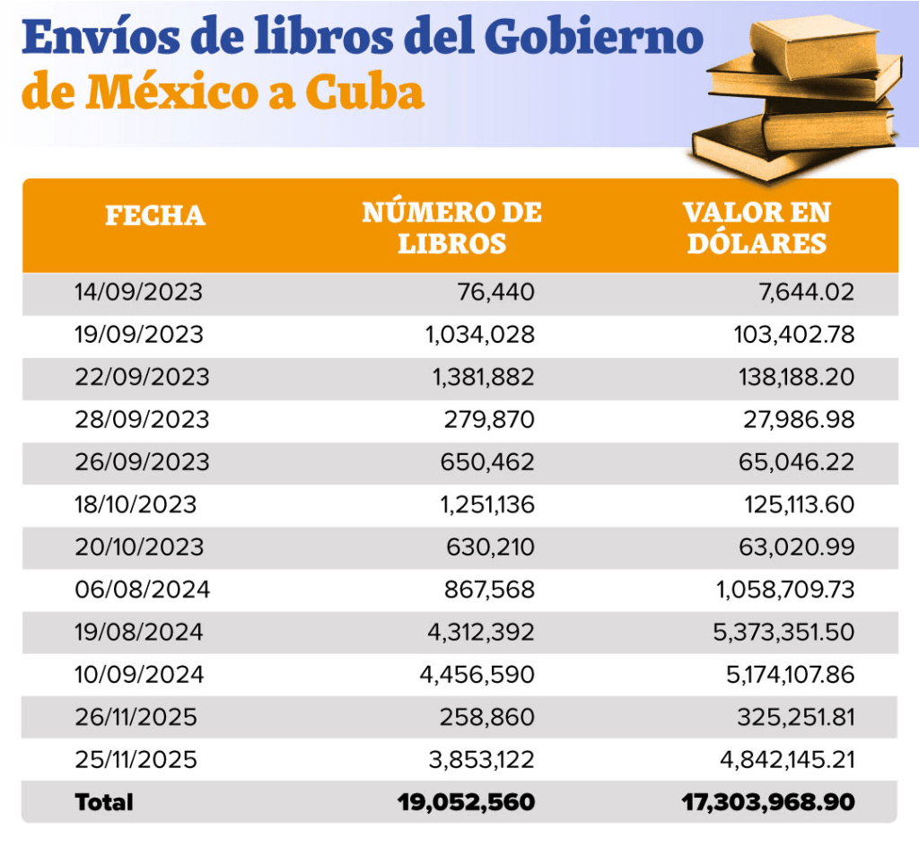 MCCI reveló en junio de 2025 que el gobierno de AMLO había gastado 387.4 millones de pesos en imprimir 15 millones de libros para el régimen cubano; nuevos documentos revelan la renovación de un acuerdo para imprimir otros 7 millones de ejemplares, de los cuales ya se enviaron 4 millones a la isla a finales de noviembre de 2025.