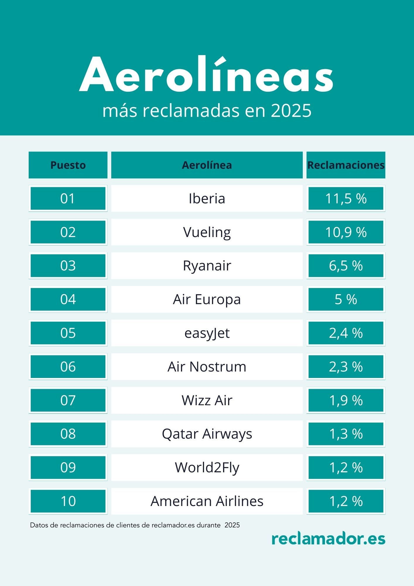 Iberia se convierte en la aerolínea más reclamada en 2025 y desbanca a Vueling tras tres años ocupando la primera posición de este ranking de reclamador . es
