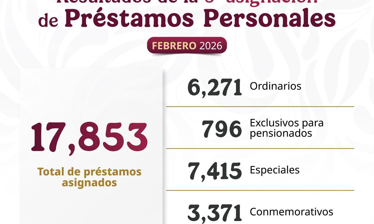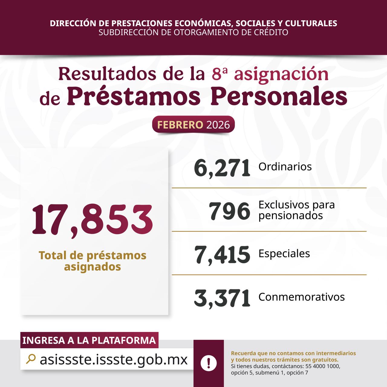 El Instituto de Seguridad y Servicios Sociales de los Trabajadores del Estado (ISSSTE), encabezado por el director general Martí Batres Guadarrama, informó que en la octava entrega del Programa Anual de Préstamos Personales 2026 se asignaron 17 mil 853 créditos a personas trabajadoras, pensionadas y jubiladas que cumplieron con los requisitos establecidos.