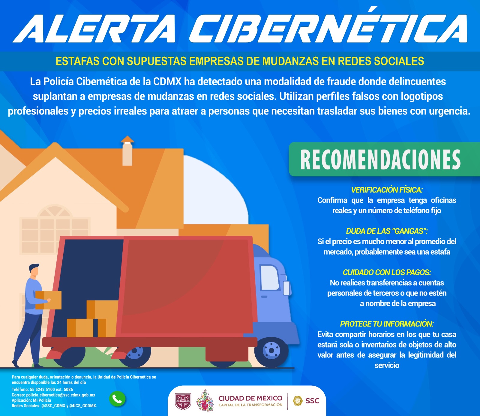 La Secretaría de Seguridad Ciudadana (SSC) de la Ciudad de México alertó a los usuarios de la red pública de internet por ciberdelincuentes que aprovechan redes sociales y plataformas digitales, para ejecutar fraudes sofisticados, en este caso mediante supuestas empresas de mudanzas que utilizan perfiles falsos, precios bajos y documentos apócrifos para engañar a las víctimas.