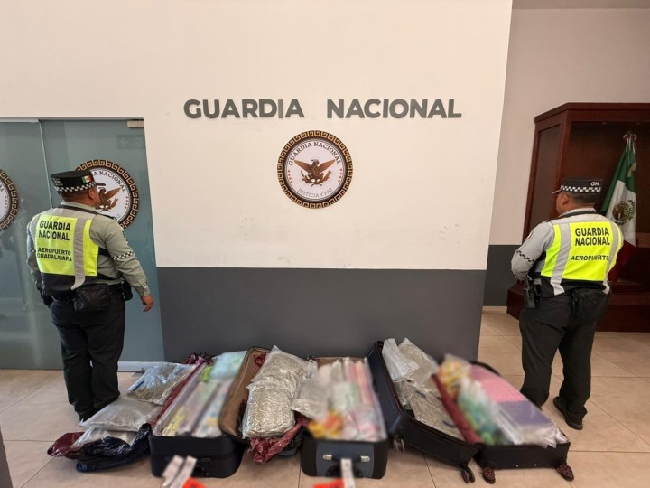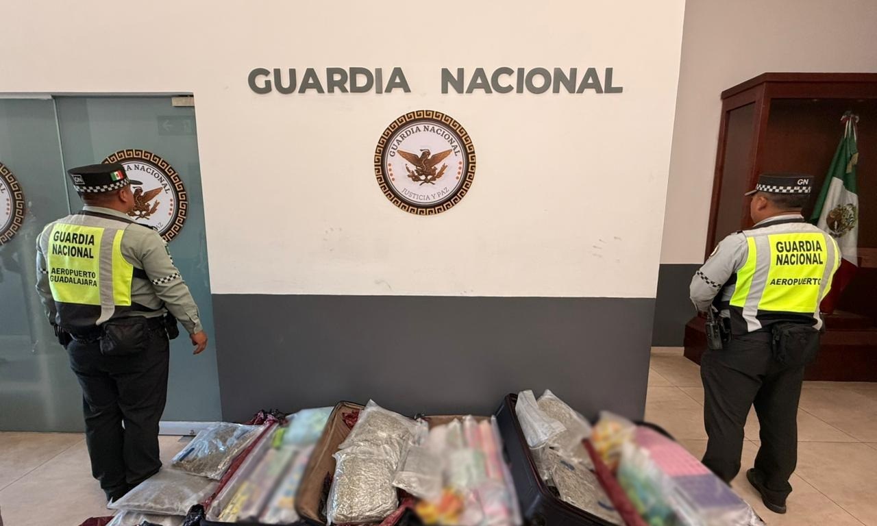 Agentes de la Guardia Nacional aseguraron paquetes con narcóticos y vapeadores, dentro de maletas abandonadas, en el Aeropuerto Internacional de Guadalajara, Jalisco.