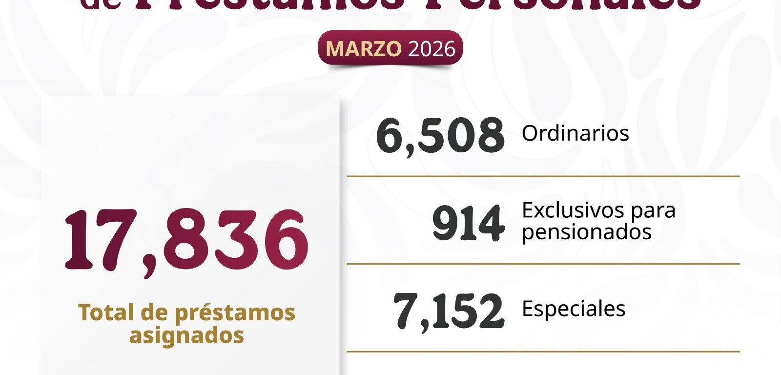 La distribución de los 17 mil 836 préstamos personales fue: 6 mil 508 ordinarios; 914 exclusivos para pensionadas y pensionados; 7 mil 152 especiales; y 3 mil 262 conmemorativos.