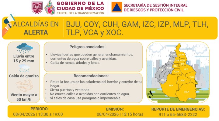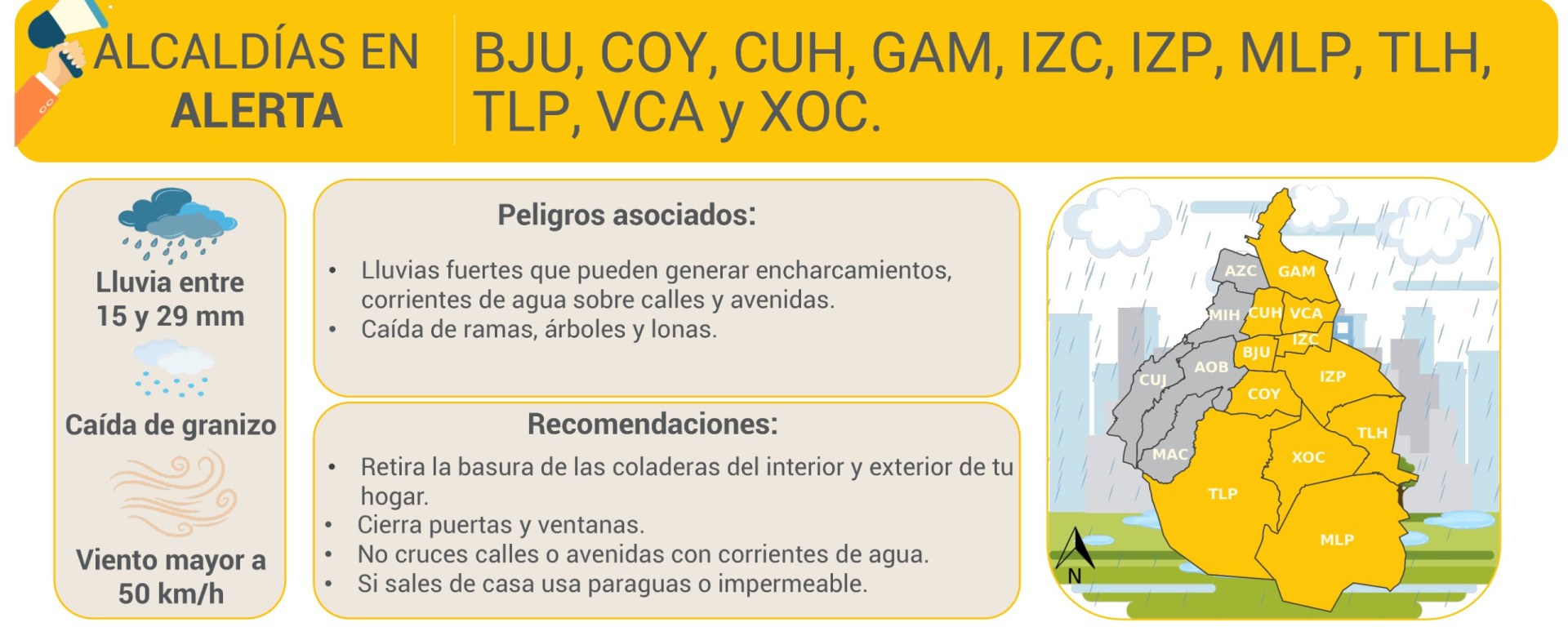 Según la dependencia, la resencia de lluvia fuerte será en las demarcaciones: Benito Juárez, Coyoacán, Cuauhtémoc, Gustavo A. Madero, Iztacalco, Iztapalapa, Milpa Alta, Tláhuac, Tlalpan, Venustiano Carranza y Xochimilco.