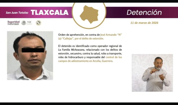 Durante su tradicional conferencia de prensa desde Palacio Nacional, García Harfuch explicó que Callejas fue detenido el 11 de marzo en San Juan Totolac en Tlaxcala y es un operador regional de La Familia Michoacana y responsable del control de los campos de adiestramiento en Arcelia.