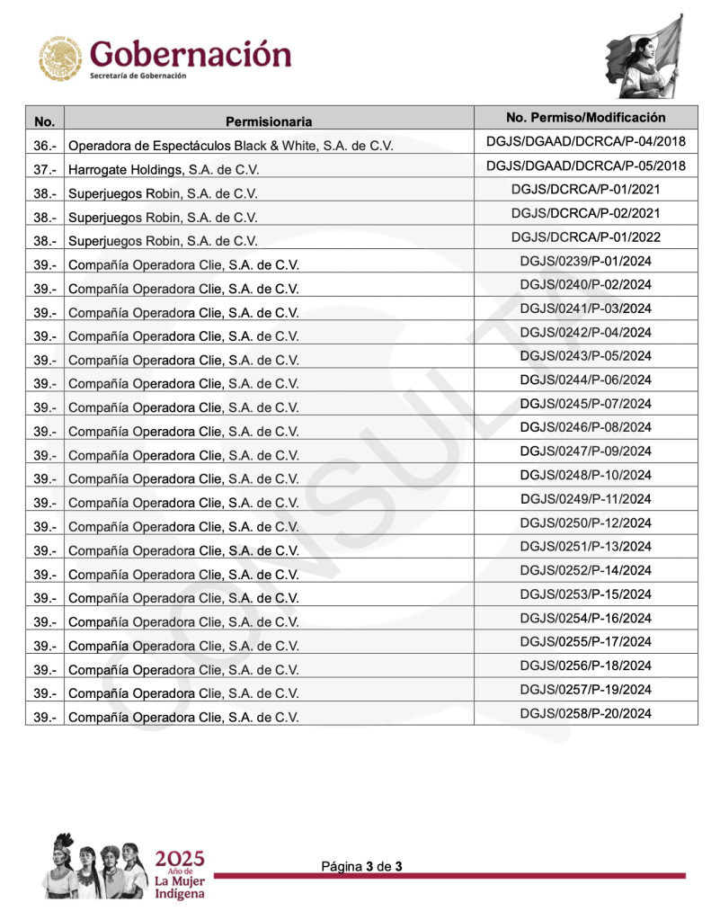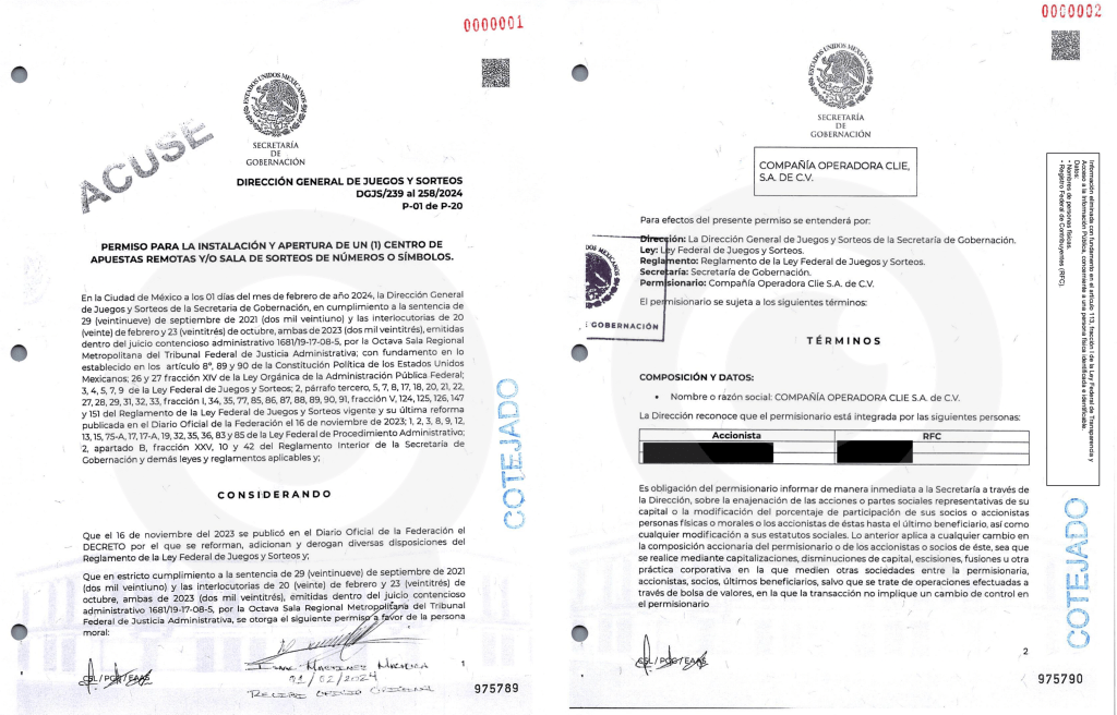 La Dirección General de Juegos y Sorteos de la Secretaría de Gobernación (Segob) autorizó a Compañía Operadora Clíe la instalación y apertura de 20 centros de apuestas el 1 de febrero de 2024, ocho meses antes de que concluyera la gestión de AMLO, en cumplimiento a resoluciones de un juicio contencioso administrativo, de acuerdo con los permisos obtenidos por Mexicanos contra la Corrupción y la Impunidad (MCCI).