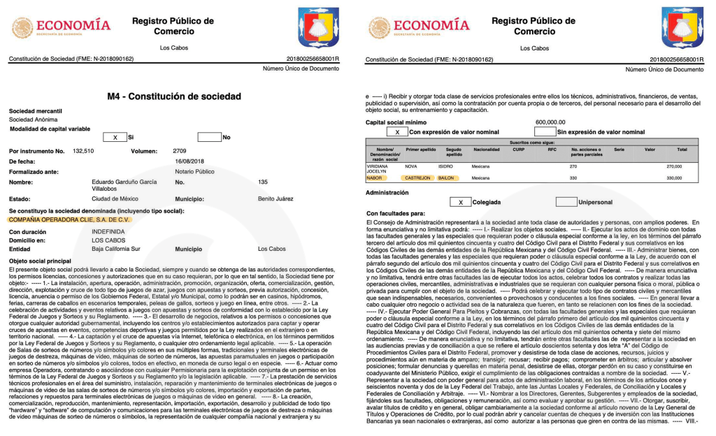 Compañía Operadora Clíe, S.A. de C.V. tiene como socios a Viridiana Jocelyn Nova Isidro, de profesión enfermera, y a Nabor Castrejón Bailón, quien es socio de Purtech de México, otra empresa dedicada al negocio de las apuestas.