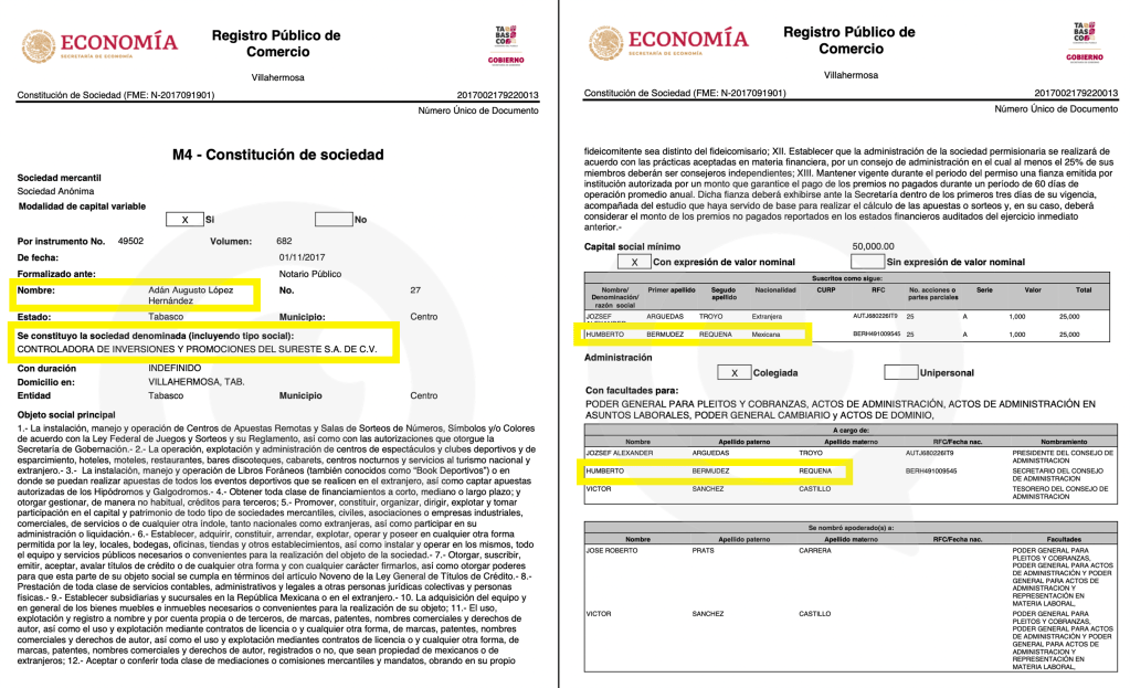 MCCI constató que con ese permiso DGJS/DGAAD/DCRCA/P-01/2017 operaban los sitios en línea CrownCity y CityBets, pertenecientes a Controladora de Inversiones y Promociones del Sureste, donde es socio Humberto Bermúdez Requena -hermano del ex titular de Seguridad de Tabasco- y cuya constitución atestiguó como notario el Senador morenista Adán Augusto López, como reveló MCCI en julio de 2025.