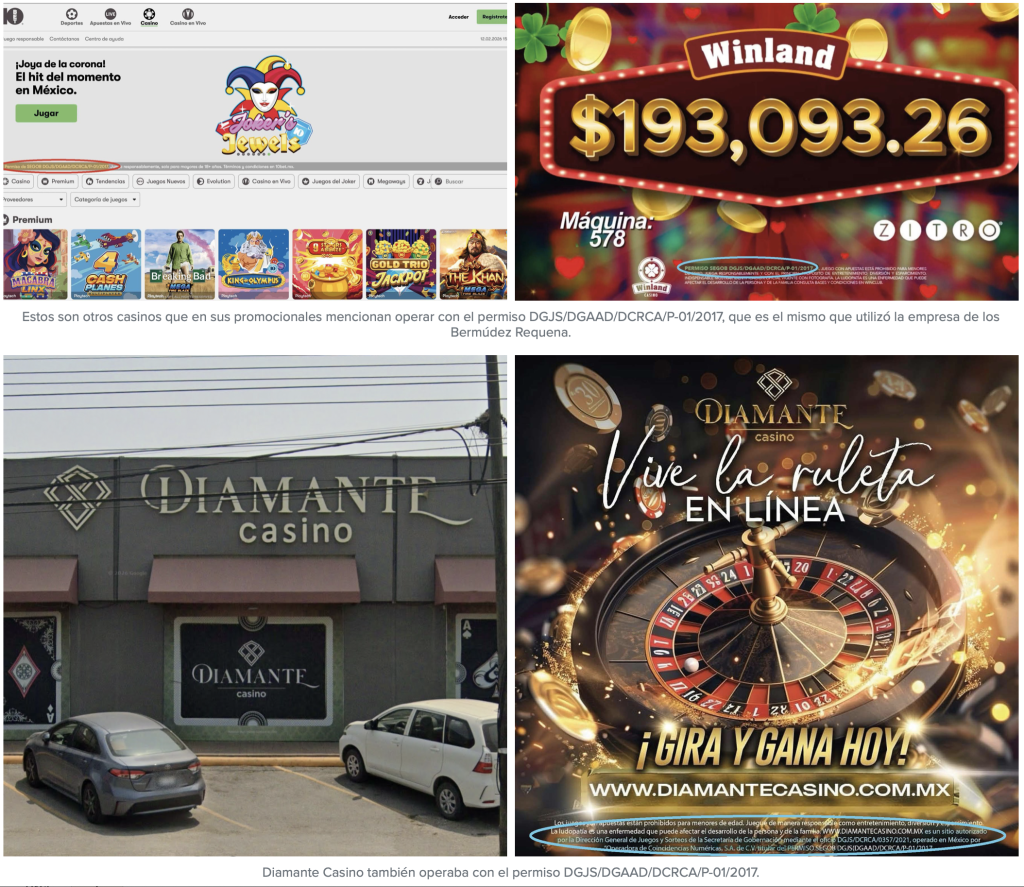 Ese mismo permiso ha amparado la operación de sitios de apuestas de la familia Bermúdez Requena, así como de múltiples casinos físicos y en línea, como 10bet.mx y vivacasino.mx.