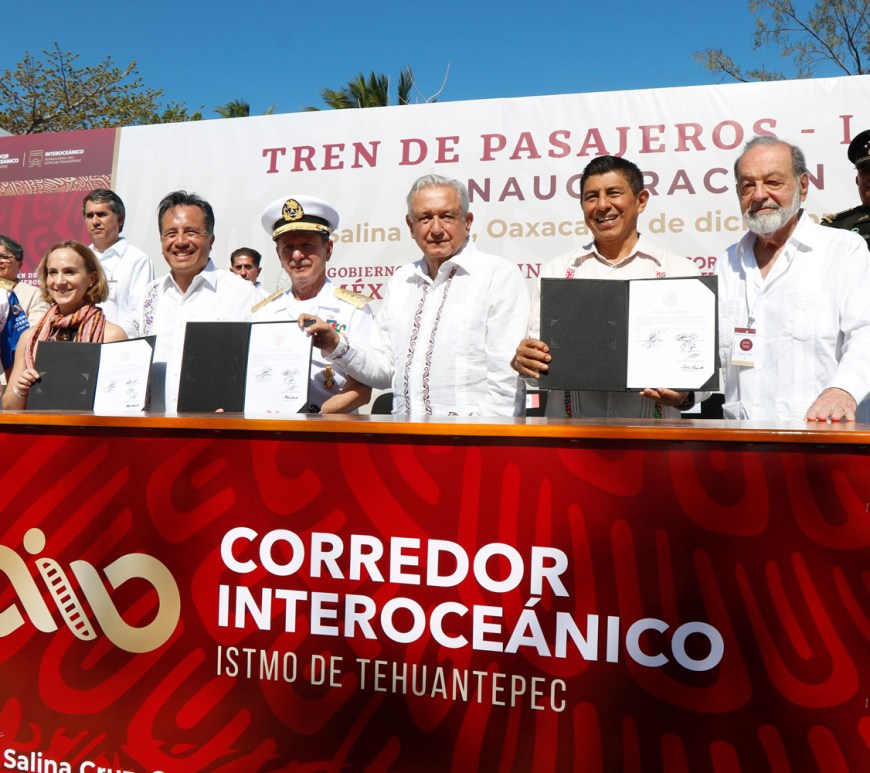 Presidente inaugura Línea Z del Tren Interoceánico del Istmo de Tehuantepec SN Redacción El presidente Andrés Manuel López Obrador inauguró en Salina Cruz, Oaxaca, la Línea Z del servicio de pasajeros del Tren Interoceánico del Istmo de Tehuantepec, que va de Coatzacoalcos, Veracruz, a Salina Cruz, Oaxaca, uniendo los océanos Pacífico y Atlántico a través de 308 kilómetros de vías férreas. Acompañado de gobernadores, servidores … Continúa leyendo Inaugura AMLO «Línea Z» del Tren Interoceánico del Istmo de Tehuantepec