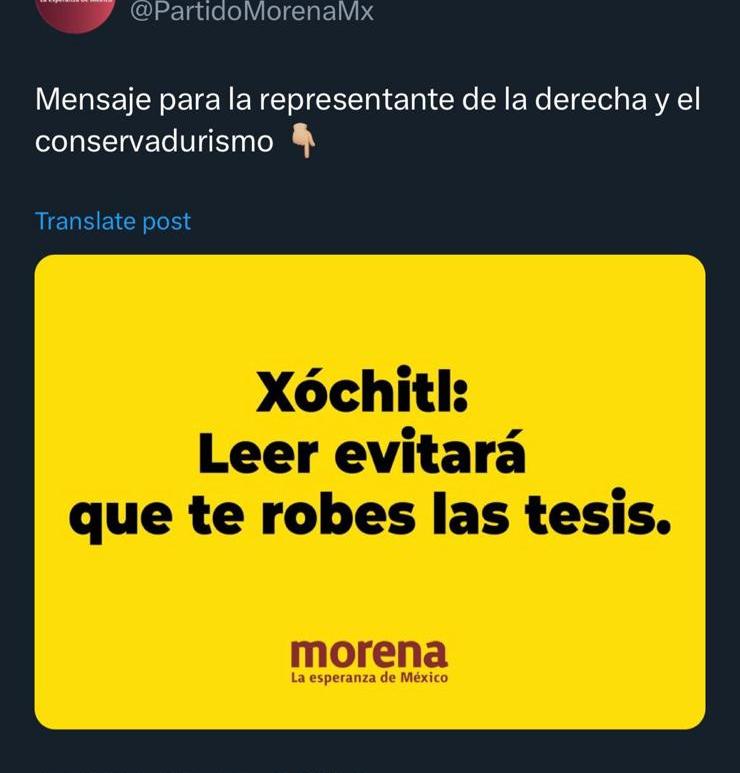 Borra Morena mensaje crítico sobre plagio de Xóchitl Gálvez