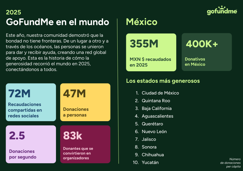 GoFundMe presentó su informe Year in Help 2025, que documentó récords de donaciones, crecimiento del apoyo comunitario y una participación histórica en México, donde se recaudaron 355 millones de pesos para causas sociales, emergencias y necesidades esenciales mediante donaciones digitales. Continúa leyendo GoFundMe impulsa solidaridad global y récord de donaciones