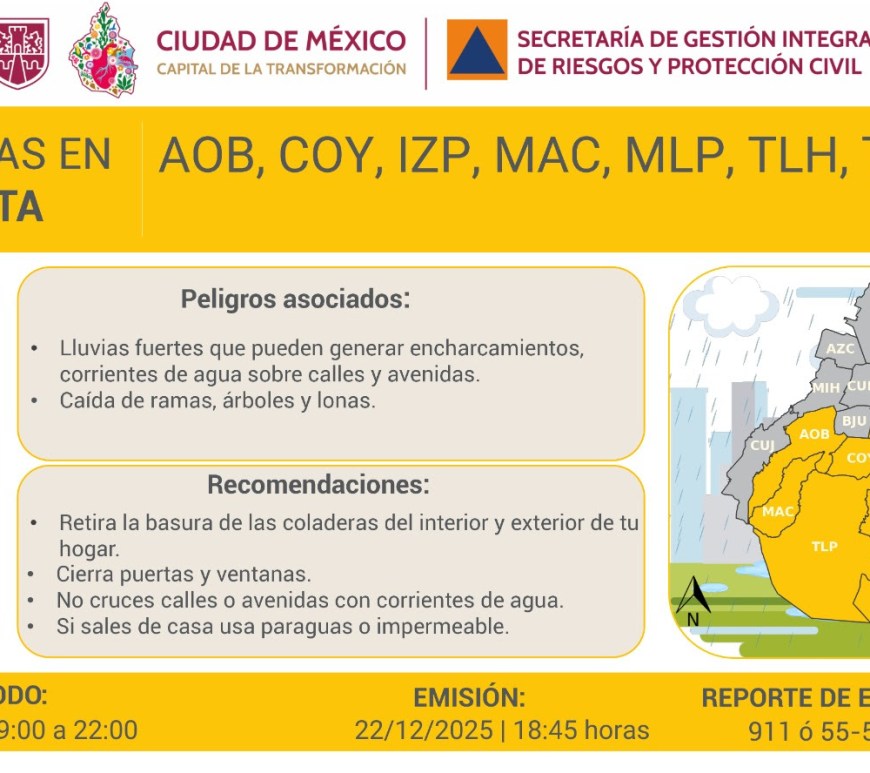 La Secretaría de Gestión Integral de Riesgos y Protección Civil activó Alerta Amarilla por lluvias fuertes en ocho alcaldías de la Cdmx, ante riesgos de encharcamientos, corrientes de agua y caída de árboles, y emitió recomendaciones preventivas para la población. Continúa leyendo Activan «Alerta Amarilla» por lluvias fuertes para esta noche y madrugada
